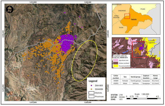 APA StyleCastillo-Doloriert, H., Velasquez, D., Matsuno, Y., Hoces, D., & Wheeler, J. C. (2024). Conflict between Farmers and Guanacos (Lama guanicoe cacsilensis): Field Surveys, Remote Sensing, and Interviews Provide Information for Conservation of a Critically Endangered Species in Southern Peru. Animals, 14(5), 658. https://doi.org/10.3390/ani14050658
