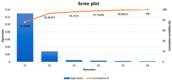 Table 5 reports Pillai’s trace criterion to be highly statistically significant (p < 0.01); hence, the RCCA is valid. As shown in Figure 1, the first variate (F1) alone explains 76.28% of the variability in both datasets. This figure shows the six eigenvalues for each of the variates determined.