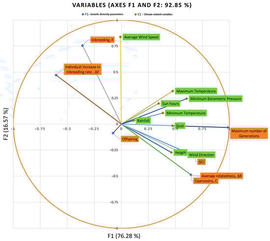 Figure 2 suggests that the variable offspring is correlated and correlated negatively with Variates 1 and 2. They are also anti-correlated with the minimum and maximum temperature, sunlight hours, minimum barometric pressure, and rainfall. This means that with climatic parameters such as minimum and maximum temperature, sunlight hours, minimum barometric pressure, and rainfall, the number of offspring reduces. Oppositely, the variables of inbreeding (f) and individual increase in inbreeding rate (ΔF) and average wind speed are correlated positively with Variates 1 and 2. They are also anti-correlated with the other diversity parameters such as genetic conservation index (GCI), average relatedness (ΔR) and number of maximum generations, and climatic-related variables such as altitude, gust speed, and wind direction.
