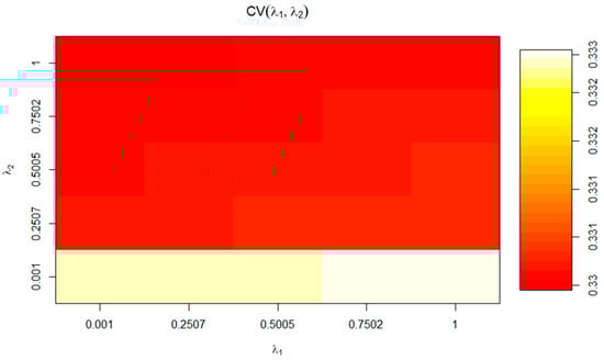 Regularization parameters (λ1 and λ2) were estimated using the tune.rcc function [59], where a set of positive values were chosen to evaluate the cross-validation (CV) score for each point in the network, achieving an optimal value for λ1 and λ2 that offered the highest CV score.