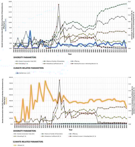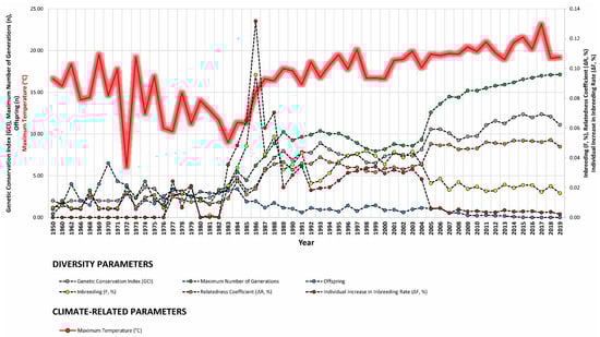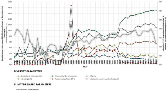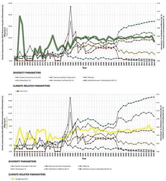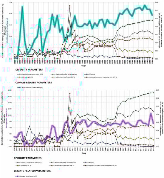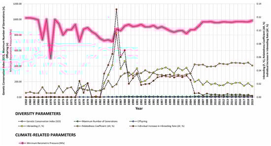 Relatedness coefficient (ΔR, %), genetic conservation index (GCI), and maximum number of generations showed positive and weak correlations (0.000 < rXY < 0.300) with various climate-related variables. The strongest correlation, with a coefficient of rXY = 0.207, was observed between minimum barometric pressure and maximum number of generations. Conversely, average wind speed exhibited weak and negative correlations with the same climate-related variables (0.00 < rXY < −0.300). Inbreeding (F, %) and individual increase in inbreeding rate (ΔF, %) displayed similar trends, with slightly stronger correlations reported for the latter, especially with all climate-related variables (twice the values for inbreeding). However, the linear relationship between inbreeding (F, %) and individual increase in inbreeding rate (ΔF, %) was weak but positive for average wind speed (0.000 < rXY < 0.300). Offspring showed a negative and weak linear correlation with all climate-related variables, except for minimum barometric pressure, where the correlation was negligible (rXY = 0.002) (Table 4).