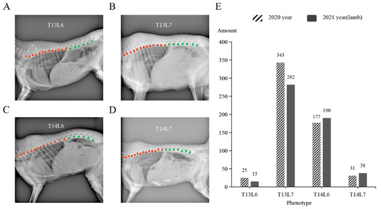 In general, sheep have 7 cervical vertebrae (C7), 13 thoracic vertebrae (T13), 6 lumbar vertebrae (L6), 4 sacral vertebrae (S4), and a variable number of caudal vertebrae. In this study, we investigated the number of vertebrae (thoracic and lumbar) in 576 adult sheep and 525 lambs. We observed four types of vertebral numbers, namely, T13L6, T13L7, T14L6, and T14L7 (Figure 1A–D). Among these types, T13L6 is considered as the primitive form of vertebrae in mammals [2]. The proportions of these vertebral types were as follows: T13L6 (3.6%), T13L7 (56.8%), T14L6 (33.3%), and T14L7 (6.3%) (Figure 1, Table 1). Notably, a significant majority (96.4%) of the Ujimqin sheep displayed multi-vertebral traits (Figure 1E, Table 1).