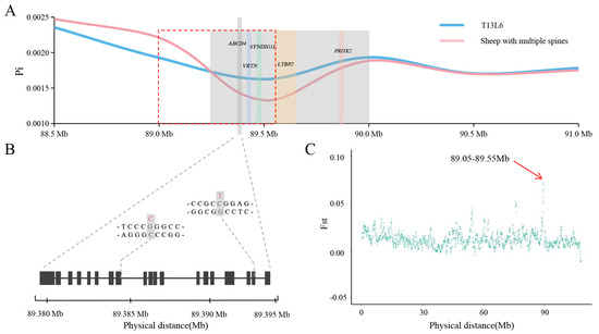 Selection analyses identified a candidate region. (A) Pi value in 50 kb sliding windows with 5 kb steps in T13L6 (blue line) and multi-vertebral sheep (red line) from 88.5 to 91.0 Mb on chromosome 7. The shaded region indicates 89.25–90.0 Mb screened by Pi, and the red dotted box region represents 89.0–89.55 Mb screened by Fst. The shadows of the other colors represent genes in this region. (B) Schematic diagram of ABCD4 exon structure and two missense mutations in ABCD4 exon. X-axis represents the physical distance on chromosome 7. (C) Fst distributions plotted for sheep chromosome 7.