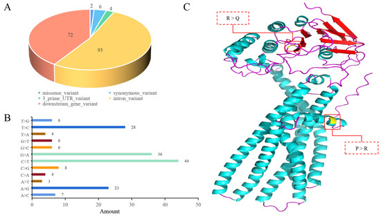 Statistics of mutation types in ABCD4 gene (Chr7: 89379307–89394764). (A) Pie plot of SNP types in ABCD4 gene (Chr7: 89379307–89394764). (B) Bar plot of base types in ABCD4 gene (Chr7: 89379307–89394764). The X-axis represents the mutation number, and the Y-axis represents the mutation type. (C) The three-dimensional protein structure of ABCD4 (sheep) is predicted using Alpha-Fold, and the location of the protein structure is affected by missense mutations in the ABCD4 gene.