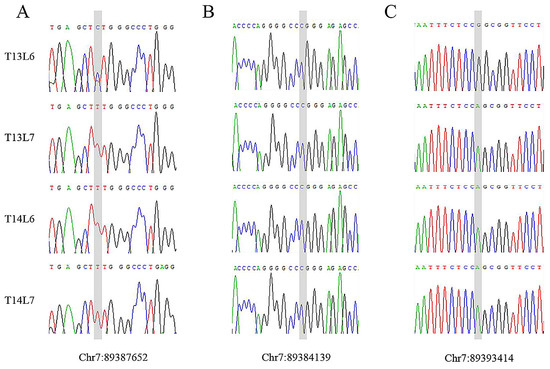 Sanger sequencing of the three candidate SNPs in the sheep ABCD4 gene (sequencing of complementary chain). The shadows in figures (A–C) indicate the locations of candidate mutations and base types in sheep with different vertebral numbers.