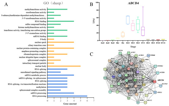 The expression of ABCD4 and related gene enrichment analysis. (A) Gene Ontology (GO) analysis of the top 100 genes co-expressed with ABCD4 obtained using GEPIA2. Green indicates the top 10 GO terms of the molecular function, yellow indicates the top 10 GO terms of the cellular component, and blue indicates the top 10 GO terms of the biological process. The X-axis represents the number of genes, and the Y-axis represents the GO term. (B) The expression of the ABCD4 gene in mice during the embryonic development period (from 2 cells to E11.5). The X-axis represents the developmental stage, and the Y-axis represents TPM (transcripts per kilobase million). (C) Co-expression network of 40 genes co-expressed with ABCD4 was obtained using the STRING tool.
