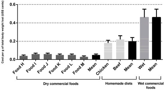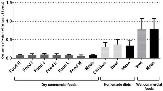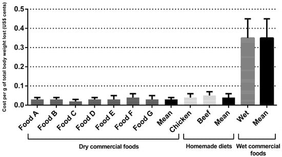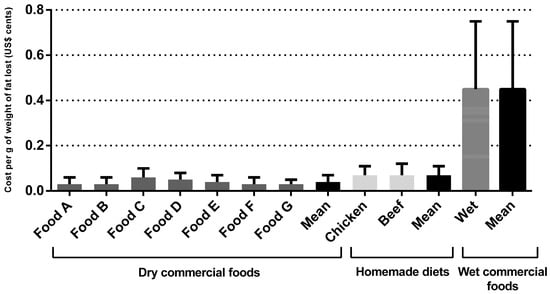 Regarding the dry commercial prescription diet for weight loss for dogs, the monthly and total cost per kilogram of metabolic weight were US$2.77 ± 0.78 and US$17.35 ± 5.66, respectively. The monthly and total cost per kilogram of metabolic weight cost for the wet commercial diet for weight loss were US$30.77 ± 3.28 and US$30.58 ± 6.19, respectively, for dogs and cats. The cost for weight loss using homemade diets was higher than dry commercial foods (p < 0.001) (Table 3). For the chicken-based diet, the monthly and total cost per kilogram of metabolic weight were US$4.43 ± 0.46 and US$27.68 ± 5.49, respectively. For the meat-based diet, the monthly and total cost per kilogram of metabolic weight were US$4.96 ± 0.50 and US$31.01 ± 6.16, respectively. Dry commercial diets cost an average of US$0.03 ± 0.01 cents per gram of total body weight lost, the wet commercial diet cost an average of US$0.35 ± 0.10 cents, and for the homemade diets this average was US$0.05 ± 0.01 cents (p < 0.001). Regarding the grams of fat eliminated, the results followed the same pattern (p < 0.001), with a higher cost for wet commercial diets (US$0.45 ± 0.30 cents), followed by homemade diets (US$0.07 ± 0.04 cents), compared to dry commercial prescription diets (US$0.03 ± 0.02 cents). The cost per gram of total body weight lost and per gram of fat eliminated are shown in Figure 1 and Figure 2 and Table 3, respectively. For cats, the monthly and total cost per kilogram of metabolic weight for the dry commercial diets were U$4.07 ± 0.96 and US$21.59 ± 3.66, respectively. For the wet commercial foods, these presented the highest cost (p < 0.001); these costs were US$30.58 ± 6.19 and US$162.16 ± 23.16, respectively, for monthly and total cost per kilogram of metabolic weight. For the chicken diet, the monthly and total cost per kilogram of metabolic weight were US$11.85 ± 3.04 and US$62.83 ± 8.97, respectively. For the meat diet, the monthly and total cost per kilogram of metabolic were US$14.78 ± 3.79 and US$78.40 ± 11.19, respectively. The dry commercial prescription diet had an average of US$0.06 ± 0.08 cents per gram of total body weight lost, while in wet commercial diets and homemade diets the averages were US$0.46 ± 0.09 and US$0.19 ± 0.04 cents (p < 0.001), respectively. Regarding the grams of fat eliminated, the results followed the same pattern, with a higher cost (p < 0.001), for wet commercial diets (US$0.78 ± 0.30 cents), followed by homemade diets (US$0.33 ± 0.13 cents) and dry commercial diets (US$0.10 ± 0.03 cents). The costs per gram of total body weight lost and per fat eliminated are shown in Figure 3 and Figure 4 and Table 3, respectively. The costs with weight loss diets are shown in Table 3. Note: all costs were estimated in Brazilian reais (R$) and then converted to US$ dollar (conversion rate: 1 US$ dollar was equivalent to R$4.91).