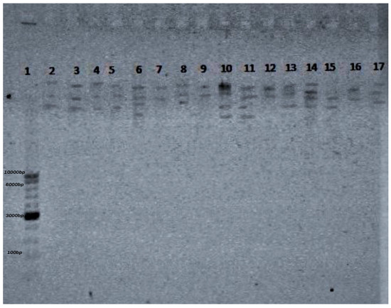 Restriction profile obtained following the digestion of the DNA of selected phages with restriction enzymes. 1—EurX Perfect 100–10,000 bp DNA Ladder, 2—φ 4296, enzyme EcoRI, 3—φ 7559, enzyme EcoRI, 4—φ 6019, enzyme EcoRI, 5—φ 698, enzyme EcoRI, 6—φ 4296, enzyme HindIII, 7—φ 7559, enzyme HindIII, 8—φ 6019, enzyme HindIII, 9—φ 698, enzyme HindIII, 10—φ 4296, enzyme NotI, 11—φ 7559, enzyme NotI, 12—φ 6019, enzyme NotI, 13—φ 698, enzyme NotI, 14—φ 4296, enzyme BSU15I, 15—φ 7559, enzyme BSU15I, 16—φ 7559, enzyme BSU15I, 17—φ 6019 enzyme BSU15I.