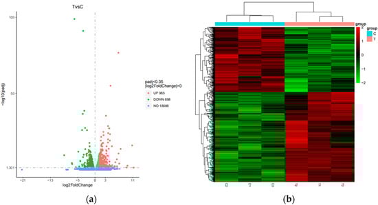 Total RNA was extracted using a Trizol reagent (Transgen Biotech, Beijing, China). Thermo Scientific NanoDrop 2000c (ThermoFisher Scientific Inc., Waltham, MA, USA) was used to determine the concentration and purity of the extracted RNA. The integrity of the RNA was detected by 1% agarose gel electrophoresis. The total amount of RNA should be ≥1 μg, the concentration ≥ 50 ng/μL, and the value of OD 260/OD 280 should be between 1.8 and 2.2 [20]. An oligomer magnetic bead (dT) approach was used to enrich Poly A mRNA from total RNA (6 samples) [21,22]. A cDNA library was constructed by synthesizing cDNA from random hexamers, purifying cDNA, and amplifying it by PCR. A NEBNext® Ultra RNA Library Prep Kit for Illumina was used to perform RNA-seq library preparation and, after library inspection, qualified. Finally, paired-end sequencing of different libraries was accomplished using Illumina sequencing.