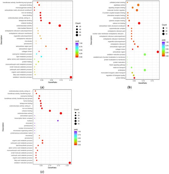 GO item enrichment analysis: (a) Scatterplot diagram of differentially expressed gene GO enrichment analysis; (b) scatterplot of GO enrichment analysis of up-regulated differentially expressed genes; (c) scatterplot of GO enrichment analysis of down-regulated differentially expressed genes.