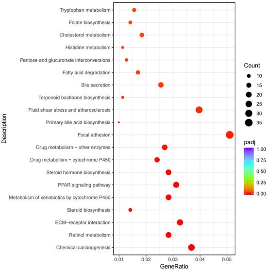 The analysis of the KEGG pathway shows that DEGs were significantly enriched in 26 pathways, including chemical carcinogenesis, retinol metabolism, and ECM-receptor interaction (Figure 3). Among them, fatty acid degradation, the PPAR signaling pathway, the ECM-receptor interaction, and the PI3K-Art signaling pathway are closely related to lipid metabolism (Figure 4 and Figure 5). Sixteen lipid-metabolism-related DEGs were identified in the livers of the fattening group and the grazing group; among these genes, 4 genes were up-regulated and 12 genes were down-regulated (see Supplementary Table S5). These 16 genes were mainly enriched in the four pathways mentioned above.