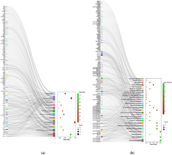 Sankey map of differentially expressed genes: (a) Sankey map of the KEGG enrichment analysis of up-regulated differentially expressed genes; (b) Sankey map of the KEGG enrichment analysis of down-regulated differentially expressed genes.