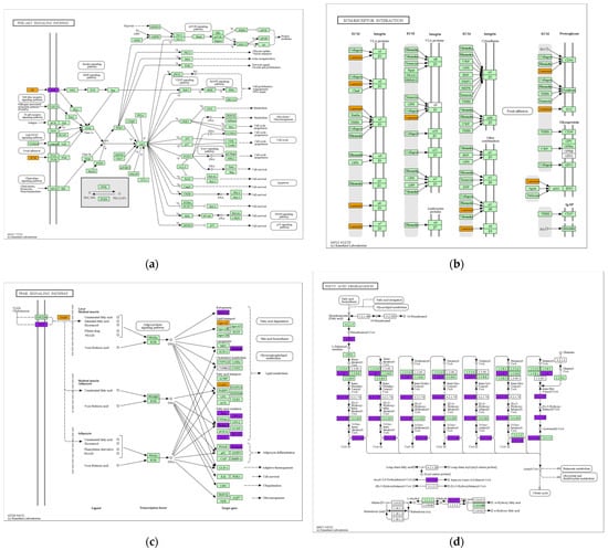 Significant enrichment pathway of differentially expressed genes: (a) PI3K-Akt signaling pathway; (b) ECM-receptor signaling pathway; (c) PPAR signaling pathway; (d) fatty acid degradation pathway.