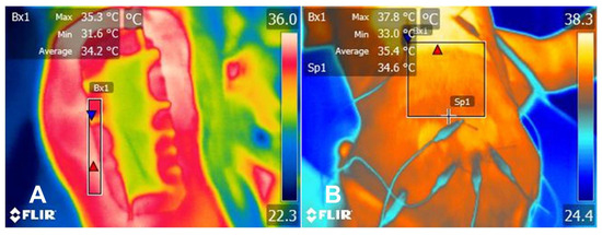 Infrared thermography (IRT) is a technique that uses a specialized camera to evaluate the infrared radiation related to the temperature of a body [1,2,3]. In mammals, the infrared radiation emitted from the body is highly related to the core body temperature and the ability of consequent changes in the peripheral blood flow to increase or decrease the amount of radiated heat [4,5,6]. IRT has been used to estimate the body temperature of animals and humans through surface temperature readings [7,8]. Nonetheless, several events can alter the blood flow of cutaneous blood vessels via shifts in peripheral vasodilation or vasoconstriction. Examples of these events are lesions in dermal or muscular tissue, and bone, ligament, joint, and tendon injuries [9,10,11,12]. After tissue damage, proinflammatory mediators are released, causing the vasodilation of capillaries, venules, or arterioles, with a subsequent increase in local temperature [13,14,15]. On the other hand, local hypothermia can be seen in patients with vascular compromise and ischemia issues [16,17].