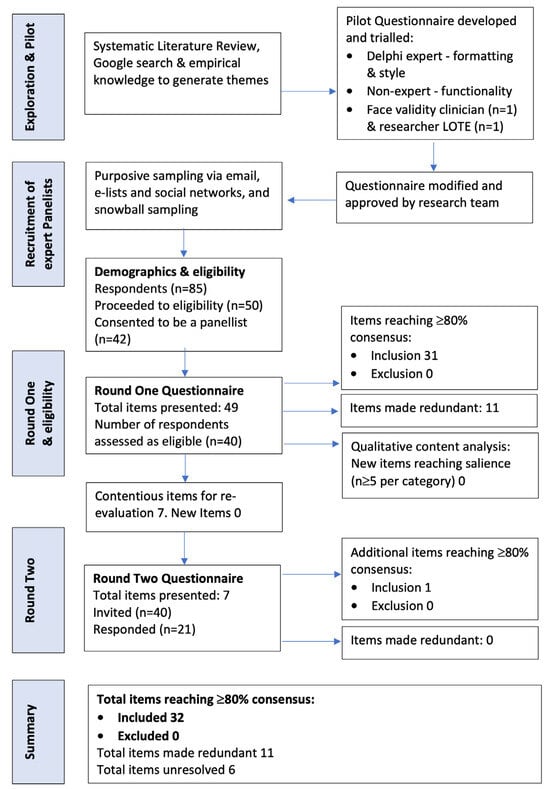 This study forms one part of a larger research project examining intervention development and quality assurance in CAP []. The Delphi methodology, a well-established approach [,,], was employed to obtain expert consensus through successive data collection rounds, addressing contentious areas identified in a systematic literature review []. Ethics approval for the research project was granted by the University of Melbourne Human Research and Ethics Committee (1853284), and guidance on Conducting and Reporting Delphi Studies (CREDES) was followed []. The methodology for the research project has been reported in detail elsewhere []. See Figure 1 for an overview of this study.