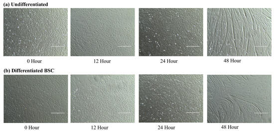 Cell growth from undifferentiated and differentiated cell treatments. Cells were visualized at 100× across 0, 12, 24, and 48 h. (a) Undifferentiated BSCs. (b) Differentiated BSCs.