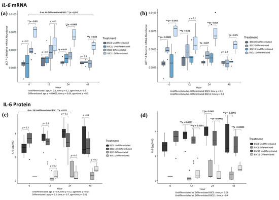 To further elucidate whether there were differences within an age group between the treatments, comparisons were made for undifferentiated vs. differentiated BSC3. There were differences (p ≤ 0.01) for 0 and 12 h, a trend (p = 0.07) at 24 h, and no difference (p = 0.9) at 48 h (Figure 2b). At 0, 12, and 24 h, differentiated BSC3 expresses higher levels of IL-6 than undifferentiated BSC3. The combined BSC3 data showed no difference (p ≥ 0.3) for 0 vs. 12 and 0 vs. 24 h, but there was a trend (p = 0.08) for 0 vs. 48 h. The expression of IL-6 decreases from 0 to 48 h, especially in the differentiated BSC3. There was no significant difference for the overall fixed effect of time (p = 0.1). Undifferentiated vs. differentiated BSC11 had observable differences (p ≤ 0.05) at 0, 24, and 48 h and no significant difference (p = 0.1) at 12 h (Figure 2b). Differentiated BSC11 had higher IL-6 expression than undifferentiated BSC11 at hour, where differences and trends were observed. The combined BSC11 data did not have differences for 0 vs. 12 (p = 0.7), 0 vs. 24 (p = 0.2), and 0 vs. 48 h (p = 0.6), or for the overall fixed effect of time (p = 0.3).