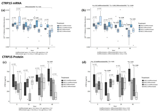 Undifferentiated BSC3 vs. differentiated BSC3 had differences (p ≤ 0.03) for 12 and 48 h, but no difference (p ≥ 0.2) at 0 and 24 h (Figure 4d). The combined BSC3 data showed a difference (p = 0.01) for 0 vs. 12 h (Figure 4d), where 0 h had higher CTRP15 protein than at 12 h for both cell types. There was no difference (p ≥ 0.2) for 0 vs. 24 and 0 vs. 48 h, and for the fixed effect of time. Undifferentiated BSC11 vs. differentiated BSC11 had no difference (p ≥ 0.4) for 0, 12, and 24 h, but there was a difference (p = 0.04) at 48 h (Figure 4d). At 48 h, the undifferentiated BSC11 had higher levels (and more variable levels) of CTRP15 in the media than the differentiated BSC11. For the combined BSC11 data, culture media did not have a difference (p ≥ 0.2) for the comparisons of 0 vs. 12, 0 vs. 24, and 0 vs. 48 h, or the fixed effect of time.