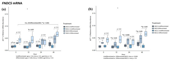 Undifferentiated vs. differentiated BSC3 had differences (p ≤ 0.03) for 0, 12, 24, and 48 h (Figure 5b). At each of these times, differentiated BSC3 expressed higher mRNA than undifferentiated BSC3. The combined BSC3 data had no differences (p ≥ 0.2) for 0 vs. 12 and 0 vs. 24 h, but there was a difference (p = 0.02) for 0 vs. 48 h (Figure 5b). There was a difference (p = 0.004) for the fixed effect of time. Across each of the time points, mRNA expression increased, especially in samples of the differentiated BSC3. The undifferentiated BSC11 vs. differentiated BSC11 had no differences (p ≥ 0.2) for 0, 12, and 24 h. There was a difference (p = 0.02) between the differentiated and undifferentiated BSC11 at 48 h (Figure 5b), where the differentiated BSCs expressed a much higher level of FNDC5 than the undifferentiated BSC. The combined BSC11 data showed no difference (p ≥ 0.2) for 0 vs. 12, 0 vs. 24, and 0 vs. 48 h (Figure 5b), or for a fixed effect of time.
