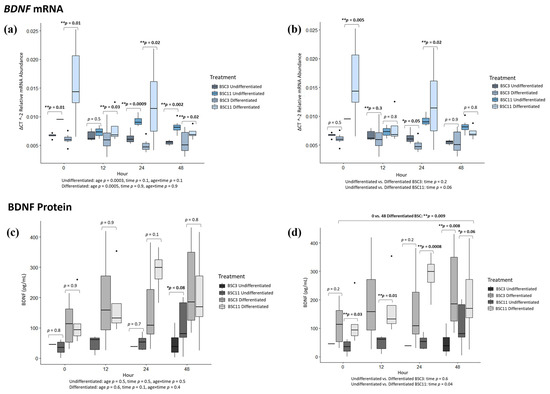 BDNF mRNA expression was challenging to detect, especially at 0 h in the undifferentiated BSC. Undifferentiated BSC3 vs. BSC11 had differences (p ≤ 0.01) at 0, 24, and 48 h, but no difference (p = 0.5) at 12 h (Figure 6a). For the hour with differences, the undifferentiated BSC11 had higher BDNF expression than the undifferentiated BSC3. The combined undifferentiated data had no differences (p ≥ 0.1) for 0 vs. 12 and 0 vs. 24 h, but there was a trend (p = 0.05) for 0 vs. 48 h (Figure 6a). BDNF mRNA trended to increase, especially for the undifferentiated BSC11. For fixed effects, there was a difference (p = 0.0003) for age but no difference (p ≥ 0.1) for time or age × time. While not much mRNA was detected for undifferentiated BSC11, what was detected was higher than the levels expressed by undifferentiated BSC3. Differentiated BSC3 vs. BSC11 had differences (p ≤ 0.01) for 0, 12, 24, and 48 h (Figure 6a). In the combined differentiated data, there were no differences (p ≥ 0.5) for 0 vs. 12, 0 vs. 24, and 0 vs. 48 h (Figure 6a). There was a difference (p = 0.0005) for the fixed effect of age, but no difference (p = 0.9) for time or age × time.