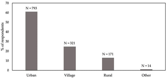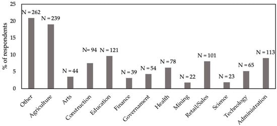 A total of 1301 of the 2170 potential respondents completed the questionnaire, representing a 60% response rate. The distributions of respondents for the three demographic factors investigated are depicted graphically. Regarding highest education level achieved, the greatest number of respondents was received for high school leavers and the least for postgraduate (Figure 1). There were three non-respondents. Regarding dwelling place, over half of respondents were from urban areas, with least in rural areas, and just a few respondents declaring “Other” (Figure 2). There were two non-respondents. Regarding occupation, the greatest number of respondents classified as “Other” occupation, but almost as many were in agriculture (Figure 3). Mining and science had relatively few respondents. There were 11 in the military that were discarded and 35 non-respondents.
