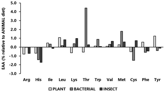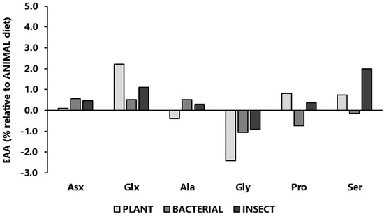 The amino acid intakes of the experimental diets, expressed as a percentage relative to the amino acid intake of the ANIMAL diet, are presented in Figure 1 (absolute amino acid values are presented in Table S1 Supplementary Materials). Although formulated to cover the known amino acid requirements of Nile tilapia, the dietary changes altered the amino acid profiles among diets. In comparison to the ANIMAL diet, some of the most striking differences worth mentioning were the lower contents of Arg, His, and Gly in the PLANT, BACTERIAL, and INSECT diets; the higher content of Thr found in the BACTERIAL diet; the lower contents of Cys in the PLANT and BACTERIAL diets; and the higher levels of Glx (glutamic acid + glutamine) in the PLANT and INSECT diets.