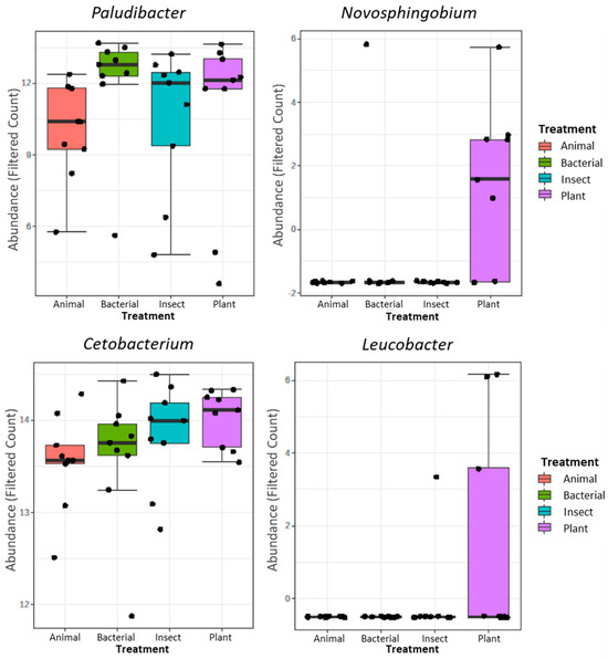 This trend in genus differences was confirmed after DeSeq2 analysis. Figure 3 shows the genus that had differential abundance among groups. In this case, the genus Paludibacter was more abundant in the tilapia´s guts when fed BACTERIAL and PLANT diets when compared to other groups. The PLANT diet led to a higher abundance of Novosphigobium and Laucobacter when compared to other groups. On the other hand, Cetobacterium was lower in the ANIMAL-fed tilapia when compared to other groups.