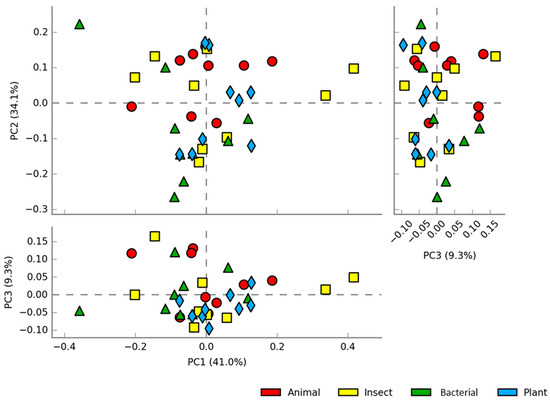 Score plots of the PCA at the genus level showing the distribution of abundance among samples of fish intestine fed diets containing different protein sources: ANIMAL, INSECT, PLANT, and BACTERIAL.