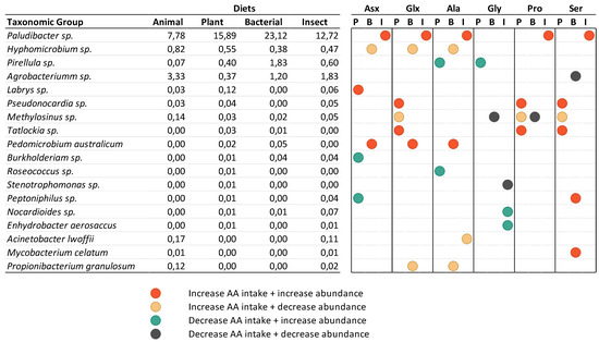 When assessing the most correlated BACTERIAL genera and species with amino acid intake in each diet (Figure 5 and Figure 6), the majority of the BACTERIAL groups were groups with low abundance. The exceptions were Pludibacter sp., Agrobacterium sp., and Propionibacterium acnes. Some patterns were observed according to the diet the fish had. For example, Pirellula sp. abundance increased with the increase in intake of amino acids (Leu, Lys, Thr, Val, Met, Cys) but only in fish fed the INSECT diet. The same group showed increased abundance when fish that were fed the PLANT diet ingested less alanine and glycine. Other examples were Flavisolibacter sp., Roseococcus sp., and Tatlockia sp., which showed increased abundances when the intake of some amino acids was reduced but only in fish fed the PLANT diet. The latter was also modulated by the intake increase in non-essential amino acids Glx, Pro, and Ser in the PLANT diet.