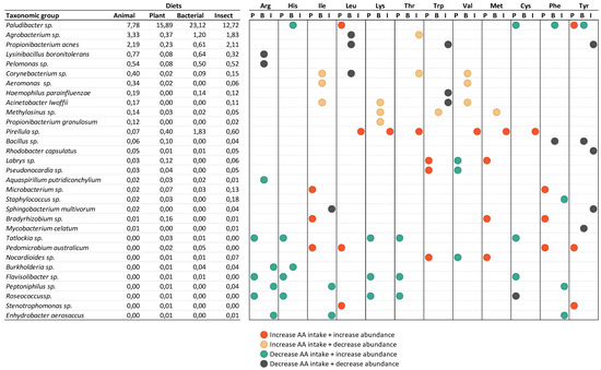 Arginine and tyrosine intake seem to have a stronger effect on modulating microbiota in the fish fed diets with alternative proteins, and the PLANT and INSECT diets seem to have a higher impact on the modulation of the selected taxonomical groups.