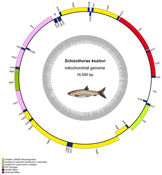 Schizothorax kozlovi Nikolsky, 1903 belongs to Cypriniformes, Cyprinidae, Schizothorax and is mainly distributed in the Jinsha River, Yalong River, and Wujiang River basins [14]. In addition, S. kozlovi is considered to be a typical plateau cold-water fish and it is also an endemic and economic fish found in the upper Yangtze River in China. The S. kozlovi has been an important fish with great value in ecology, the economy, and scientific research. Unfortunately, recent field surveys have revealed that population resources of S. kozlovi were significantly decreased and close to being depleted due to overfishing, water pollution, climate change, and habitat fragmentation [15]. S. kozlovi has also been recognized as a vulnerable species (VU) in the IUCN Red List [16]. Therefore, research on and attention to the biology of S. kozlovi are urgently needed for sustainable resource conservation. Previously, researchers have conducted studies on growth, reproduction, diet, population, and diversity [15,17,18,19,20,21]. But there has been little focus on the characterization of the mitochondrial genome and phylogenetic analysis for S. kozlovi. Only a few sequences of mitochondrial genome are included in the GenBank database (e.g., NC 027670.1) and Wang et al. [22] incompletely explored the phylogenetic relationships of some fish species in the Schizothorax. Morphologically, the S. kozlovi had some unique features such as a long and flat body covered in tiny scales, an inconspicuous keratin at the anterior edge of the jaw, a strong dorsal fin, two pairs of beards, and several pairs of developed anal scales [14,23]. These traits provided the basis for behaviors associated with adaptation to the low temperature and hypoxia of the plateau habitats [24,25]. In addition, the mitochondrial genome which encodes its functional genes might provide some key evidence about its adaptability, yet the complete mitochondrial genome data of S. kozlovi have rarely been reported and analyzed.