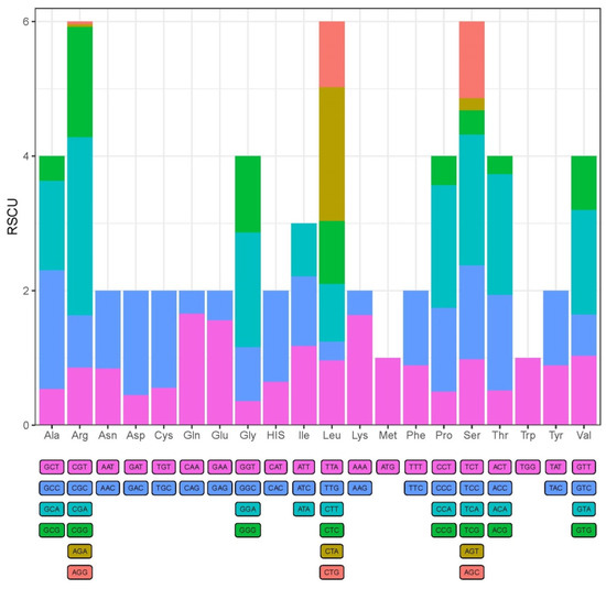 The relative synonymous codon usage (RSCU) for PCGs in the complete mitochondrial genome of S. kozlovi. The different colors represent different codon families corresponding to amino acids.