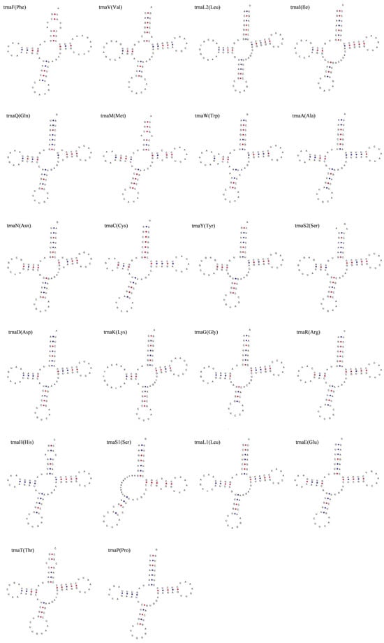 The inferred secondary structures of tRNAs in the complete mitochondrial genome of S. kozlovi. The 22 tRNA genes were labeled with standard abbreviations in the top left and the corresponding amino acids for translocation were listed in parenthesis, respectively.