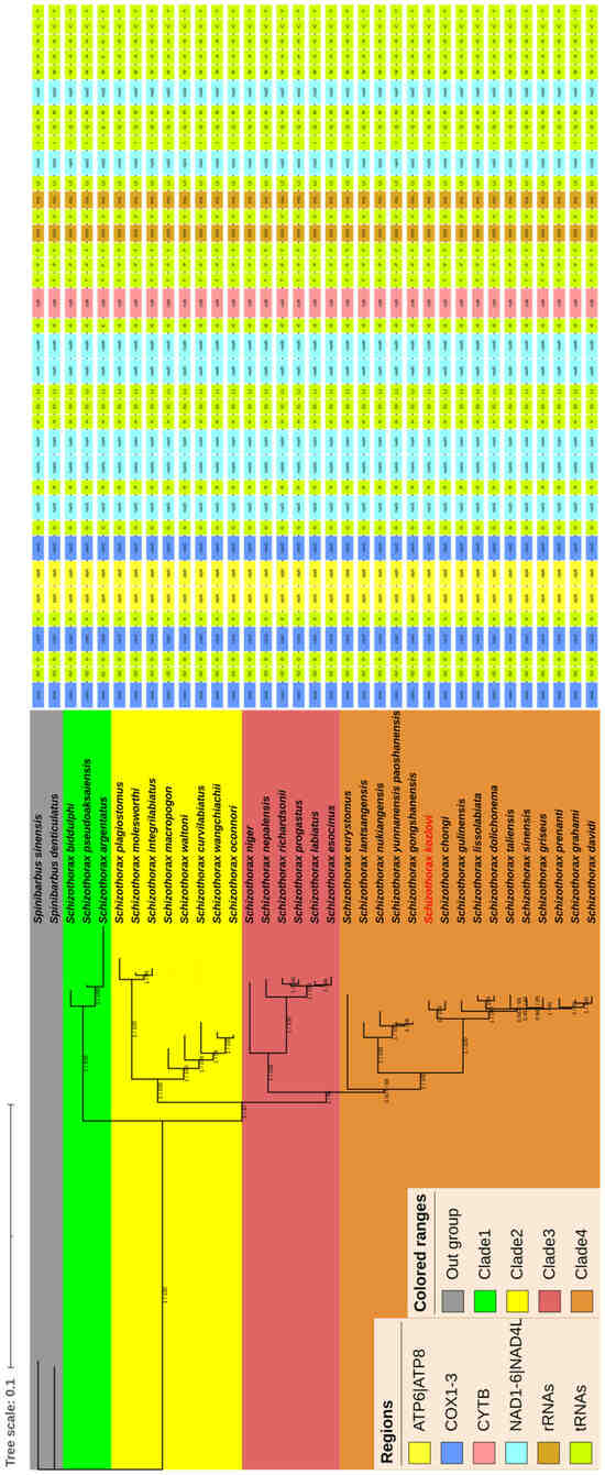 In this study, we reconstructed a phylogenetic tree for Schizothorax based on mitochondrial genomes. The results provided some insights into the phylogenetic status of S. kozlovi and its phylogenetic relationships with of Schizothorax. Previously, Rustam et al. [56] conducted a study on the phylogenetic relationships of Schizothoracinae based on 13 PCGs from the mitochondrial genome, and classified Schizothorax as a primitive taxon. Wang et al. [22] inferred the phylogenetic relationships using the 13 PCGs for 28 species and found that 13 species of Schizothorax were clustered into a clade. However, these studies did not provide specific analyses of the phylogenetic relationships of Schizothorax and the species of Schizothorax contained in the phylogenetic analyses were incomplete. In present study, the results supported that the S. kozlovi was closely related to S.chongi, which is consistent with the study by Rustam et al. [56]. Moreover, the topologies of phylogenetic tree divided the Schizothorax into four clades and did not support classification based on morphology which suggested that the Schizothorax can be divided into two subgenera of Schizothorax and Racoma, or into three groups. This result is similar to He and Chen’s [25] analyses of the phylogenetic relationships of Schizothorax based on a single mark of Cyt b. He and Chen [25] and Briolay et al. [69] also reported that adaptive evolution and interbreeding of closely related species can also have impacts on inferring phylogenetic relationships in Schizothorax. The results reminded us that it is easy to be biased in the classification of Schizothorax based solely on morphological or phylogenetic methods, and it is also not sufficiently accurate to infer phylogenetic relationships from a single or a few marks. Therefore, more samples and more sequence data are required to reconstruct a more reliable phylogenetic framework and should be combined with morphological features to accurately determine the status and relationships among species of Schizothorax.
