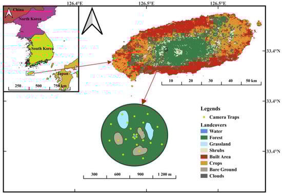 Study site location on Mt. Halla, Jeju Island, showing infrared-triggered camera installations and a schematic diagram illustrating the different types of habitats with 24 camera trapping locations.