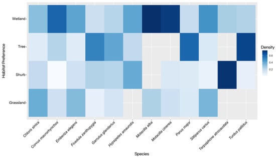 Comparison of habitat preference at camera trapping sites for each species indicated by color intensity (a deeper color represents a stronger habitat preference).