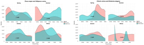 Competitive interactions among bird species are crucial in determining the structure and function of avian communities [8]. These interactions affect resource use, habitat selection, and, ultimately, the survival and reproduction of individual species [9]. Interspecies competition can lead to niche partitioning, where species adapt their behaviors and activity times to reduce competition and coexist within the same habitat [10,11]. Therefore, examining competitive interactions in the context of circadian rhythms can help us better understand the complex relationships among bird species and their environment [12].