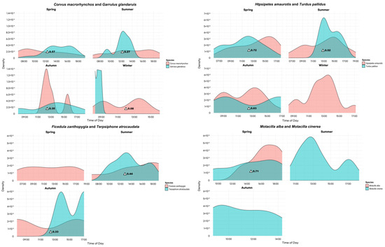 In the context of seasonal adaptations, our observations present an intriguing picture of ecological dynamics, particularly in spring and autumn. For instance, in spring, M. alba and M. cinerea exhibit a significant overlap in activity (Δ = 0.71), which might initially suggest competition for post-winter resources like insects and early blooming vegetation. However, a more nuanced interpretation reveals this as a case of temporal niche partitioning, where these species subtly exploit the same resources but at different times or within different microhabitats. For example, one species may forage in the early hours of the morning while the other may prefer late morning, or they could select different parts of the same plant or prey on different insect species [49,50]. This form of partitioning effectively reduces direct competition, facilitating their coexistence in periods abundant with resources. Similarly, the moderate overlap between C. sinica and E. elegans (Δ = 0.53) during the same season suggests some shared ecological niche elements. However, this does not necessarily translate to direct competition. Instead, it could reflect evolved strategies for exploiting different components of shared resources or engaging in distinct activities within the same habitat. Such subtle niche differentiation might involve each species specializing in certain prey types or employing unique foraging methods, allowing them to inhabit the same area without intense rivalry [51]. When transitioning to autumn, the scenario changes for species like F. zanthopygia and T. atrocaudata, where a decreased overlap (Δ = 0.33) indicates a shift toward more pronounced niche differentiation. With resources dwindling, these species may diversify their diets and foraging tactics, targeting different food sources or using the same resources in alternative manners like varying their foraging times or exploiting different habitat sections. This adaptive flexibility is a testament to their ability to respond to the pressures of changing resource availability and competition, underlining the dynamic nature of their ecological relationships and survival strategies [52].