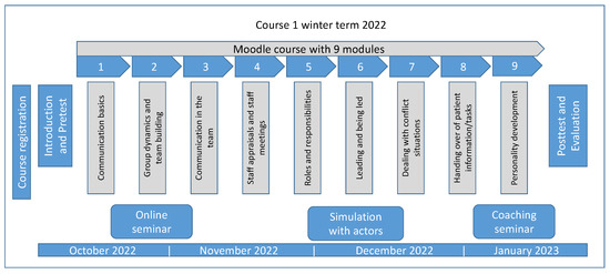Since the two professions of veterinarians and veterinary assistants are both trained at the TiHo, but only alongside each other and not together, a pilot project should improve this situation and close this gap in veterinary education. It should also address the lack of communication training within the team, which has not been covered in the academic curriculum and has only been thought between owner and veterinary assistant during training. In order to make a joint learning intervention accessible for both professions, a blended learning course was designed, i.e., a mixture of online learning and face-to-face learning [17]. At the time of the implementation of the course, there were still contact restrictions due to COVID-19, so face-to-face teaching was mainly reserved for the clinical–practical subjects and the elective courses mostly took place online. Therefore, the external circumstances influenced the course planning toward a blended learning concept. The course structure also simplified the organization with different professions. In order to take advantage of the benefits of the flipped classroom design, the theoretical content was initially elaborated independently in order to use the later attendance time more effectively for application and transfer tasks [18,19,20]. An elective interprofessional communication course was created and evaluated with the aim of exploring knowledge, attitudes and self-assessment of communication skills.