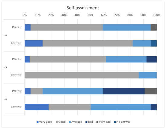 Comparative representation of self-assessment questions 1–3 between the pre- and posttest.
