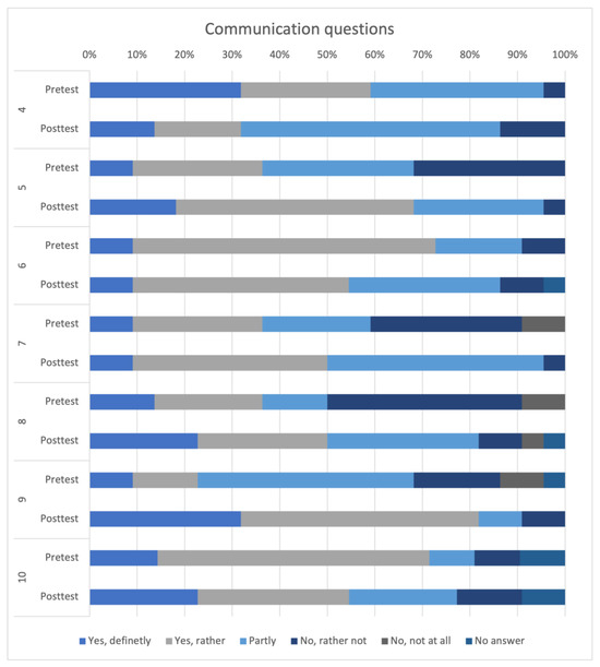 The additional questions regarding one’s communication skills and their assessment are shown in Figure 4. The majority of the participants saw room for improvement in their communication skills in the pretest and chose “Yes, definitely” or “Yes, rather” (n = 13, 59.09%). In the posttest, this value decreased by about half (n = 7, 31.82%). In the pretest, a huge number of participants rated themselves as not prepared for potential conflicts within the team (n = 7, 31.82%) and two participants even chose “No, not at all”. In the posttest, these selection options were almost not chosen at all.