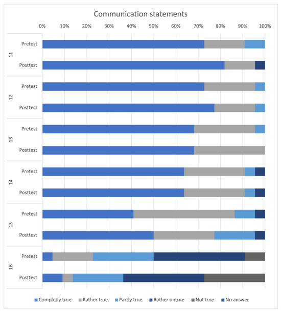 Communication statements 11–16 are depicted in Figure 5. With the exception of statement 16, these were all rated very positively. Statements 11 to 15 were not rated differently in the pre- and in the posttest. The statement “I don’t have time in my educations/studies to learn communication skills”. received higher ratings of “Rather not true” and “Not true” in the posttest (n = 14, 63.63%) than in the pretest (n = 11, 50%).