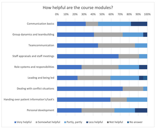 All the results of the evaluation of the helpfulness of the modules are shown in Figure 9. The module “Staff appraisals and staff meeting” was the best rated module (n = 20, 90.91%). The module “Communication basics” was the lowest rated module (n = 12, 54.55%).