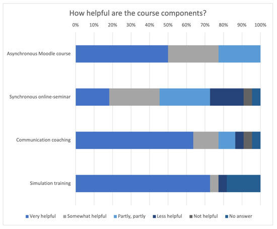 Figure 10 presents all the results of the rating of the components’ helpfulness. The simulation training was the best rated part of the course (n = 17, 77.27%), whereas the lowest rated component was the online seminar (n = 5, 22.73%).