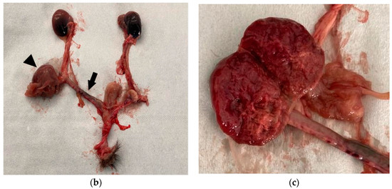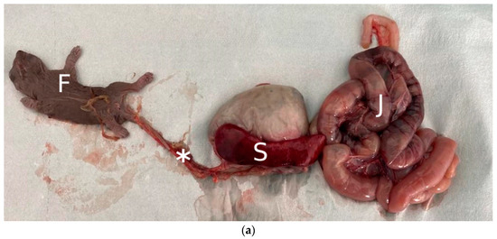 Gross findings at necropsy: (a) a thin fibrovascular cord (asterisk) connecting the full-term fetus (F) to the omentum; evident splenomegaly (S) and segmental enteropathy of the jejunum (J). (b) Genitourinary tract, gross: round lesion (black arrowhead) of 1.5 cm in diameter adjacent to the right ovary and hyperemia of the right uterine horn (black arrow). (c) Fibrin and necrotic-hemorrhagic tissue were evident on the cross-section of the periovarian tubal lesion.