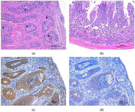 Histological appearance of lymphoma in hematoxylin and eosin-stained sections: (a) neoplastic cells are arranged in irregular nest-like structures in the ovary (asterisk) and (b) diffusely infiltrate the lamina propria of the jejunum. Immunohistochemistry, ovary: neoplastic cells stain (c) positive (brown color) for CD3 and (d) negative for CD20 markers. (d) Scattered cells staining positive for CD20 are referable to inflammatory lymphocytes.