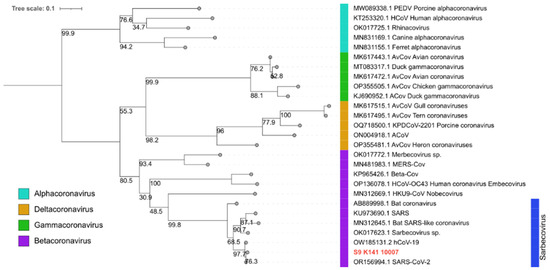 Maximum likelihood phylogenetic tree depicting 27 RdRp (RNA polymerase RNA dependent) partial nucleotide sequences from coronaviruses, classified into four genus (Alphacoronavirus, Betacoronavirus, Gammacoronavirus and Deltacoronavirus) and four subgenera: Embecovirus (KP965426 and OP136078), Merbecovirus (OK017772 and MN481983), Nobecovirus (MN312669), and Sarbecovirus (AB889998, KU973690, MN312645, OK017623, OW185131, and OR156994) of the Betacoronavirus genus. Blue bar represents sequences grouped within the Sarbecovirus subgenera. The sequence generated in this study is highlighted in red. Bootstrap values are displayed below and to the left of the nodes. The scale bar indicates genetic distance estimated by using the GTR + F + I + G4 substitution model implemented in IQTREE.