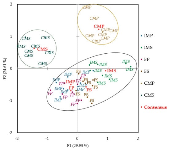 Consensus configuration, by object (different treatments of dry-cured loin). F1 = first principal component of generalized Procrustes analysis (GPA); F2 = second principal component of GPA. IMS = immunocastrated male pigs with a soya diet; IMP = immunocastrated male pigs with a pea diet; CMS = surgical castrated male pigs with a soya diet; CMP = surgical castrated male pigs with a pea diet; FS = immunocastrated female pigs with a soya diet; FP = immunocastrated female pigs with a pea diet.