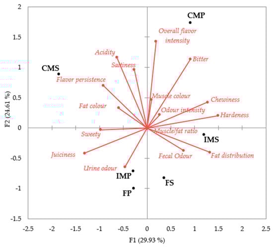 A map depicting different treatments of dry-cured loins, categorized by sex types and the animals’ diet, is shown in Figure 1. The majority of the points are situated on the first axis, since around 30% of the variability is concentrated in that area. Additionally, almost all types of dry-cured loin are clearly separated on the map, particularly CMP, CMS, and IMS. While CMS and CMP are separated on the opposite axis of F1 (left and right, respectively), the FP and IMP treatments are located on the left side of F1, whereas the FS and IMS treatments are separated, also on the opposite axis, on the right side of F1. Similarly, surgically castrated pigs are separated on the opposite axis F2 from immunocastrated male and female pigs. This indicates that the panellists could easily differentiate the dry-cured loins from surgically castrated pigs of the two feed types, although they were not able to distinguish as easily between on the other sexes (immunocastrated male and female pigs). This is understandable since immunocastrated males are of intermediate carcass quality compared to surgical castrated males and gilts []. However, more studies are required to investigate the relationship between sex and diet. The studies with a direct comparison of the sex type of pig and the legume used to feed pigs, for sensory quality traits on dry-cured loins, are scarce.