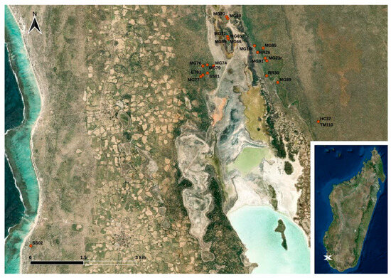 Map of the study site located in south-west Madagascar. The dots indicate the trapping points of the animals (see Table S1) (designed with QGis based on Esri satellite imagery data (https://services.arcgisonline.com/ArcGIS/rest/services/World_Imagery/MapServer, accessed on 12 December 2023)).